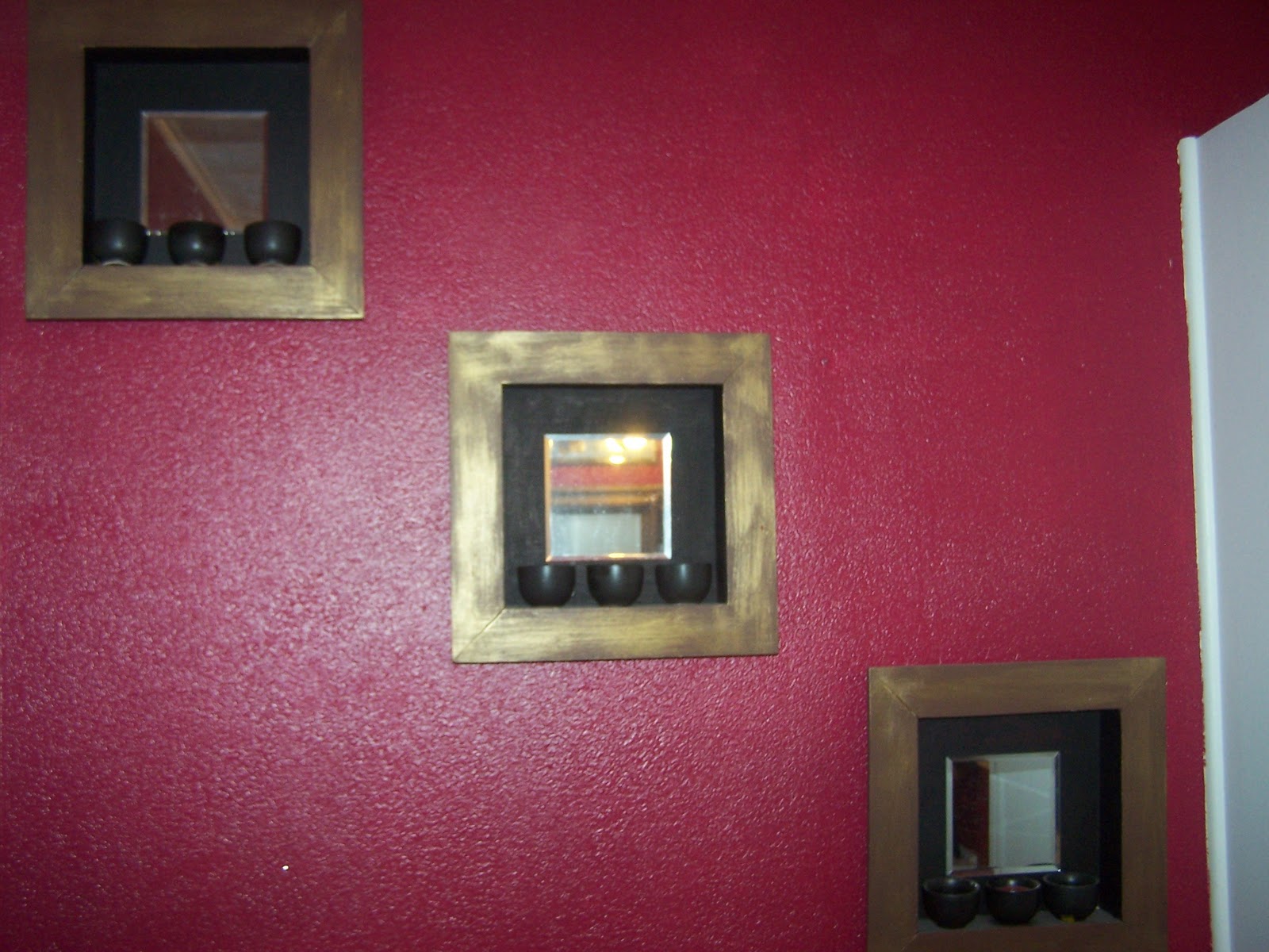 Anyway, I did my magic and painted them up, put dollar store mirrors in the center to cover the ugly glue and put some cheap little candles I found at Ross on the little ledges. They turned out pretty nice. I have them hanging in my bathroom with the rest of my oriental themed stuff. :)
